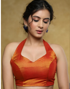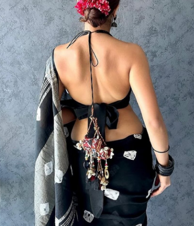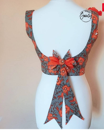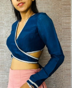 Khun fabric, a blend of cotton and silk, is well-known for its light weight and silky feel. As always, this halter-neck, sleeveless blouse drapes beautifully and provides a flattering and sophisticated appearance. Your waist appears lovely and defined thanks to the bow on the blouse. The open back shows just enough skin to make it stylish, making it romantic and daring.