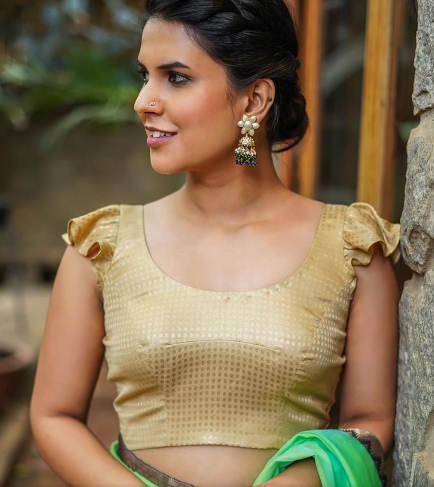 With a newfound sense of self-assurance, women are proudly sporting backless styles. The blouse’s grace is accentuated tastefully by its sleeveless cut, and the pretty bow at the back enhances the flawless fit. The striking beauty of the natural world is portrayed by the vibrant green color