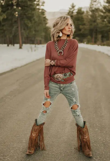 such as chokers, necklaces, bracelets, rings, anklets, headpieces, and hair accessories. Also, we have changed them to make them really special to our style .Ancestral accessories are so different and simple to style! This boho-roused outfit underneath is an ideal illustration of these assertion pieces while embracing your style sense. Obviously, those cowboy boots are a winning pair! This season, pair long boots with the following stylish outfits.